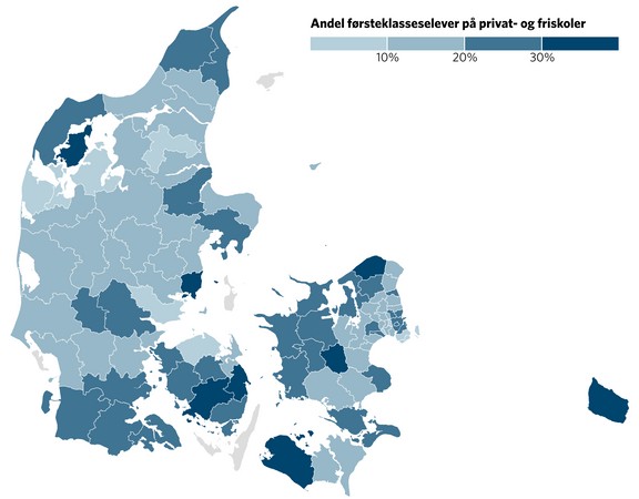 - I 40 kommuner går mindst 20 procent af børnene i 1. klasse på privatskole. For 13 år siden gjaldt det kun for 10 kommuner.