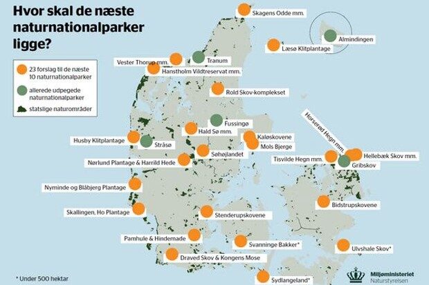 Borgere, interessenter og kommuner har indsendt forslag til, hvor Danmarks næste ti naturnationalparker skal ligge. Miljøministeriet er nu klar med en bruttoliste med 23 forslag til mulige naturnationalparker til politikere, kommuner, ministerier, interessenter og eksperter.