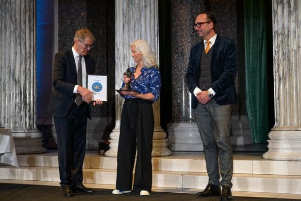 Formand for Kristeligt Dagblads bestyrelse, Mogens Madsen (t.v.), overrækker prisen til Elise Haavik og Henrik Appel, som er hhv. frivillig terapeut og landsleder for TUBA. Foto: Leif Tuxen.